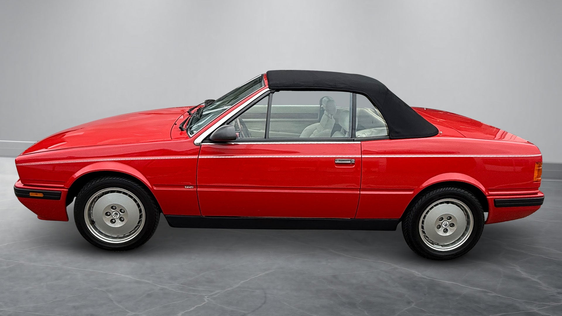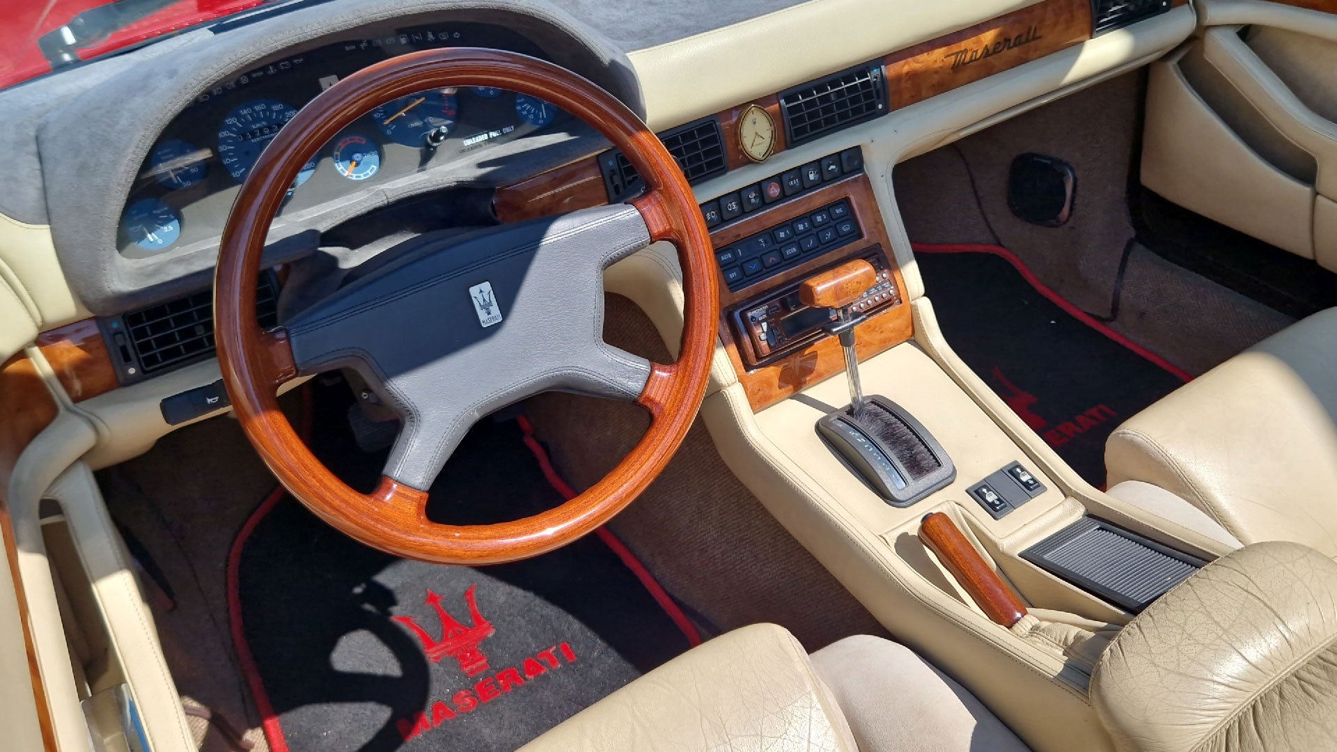 Der hier angebotene Spyder wird 1993 neu in der Schweiz mit Automatikgetriebe ausgeliefert und ist seitdem im gleichem Besitz. Die unglaublich niedrige Laufleistung von 17’500 nur im Sommer gefahrenen Kilometern ist garantiert, das Serviceheft vorhanden, der Zahnriemen, die Wasserpumpe und das Spannrollenlager wurden vor zwei Jahren durch eine Maserati-Fachwerkstatt ersetzt. Es versteht sich von selbst, dass dieses unrestaurierte, ursprünglich erhaltene Stück italienischer Autobaukultur seit seinem 30. Geburtstag einen Veteranen-Eintrag hat.