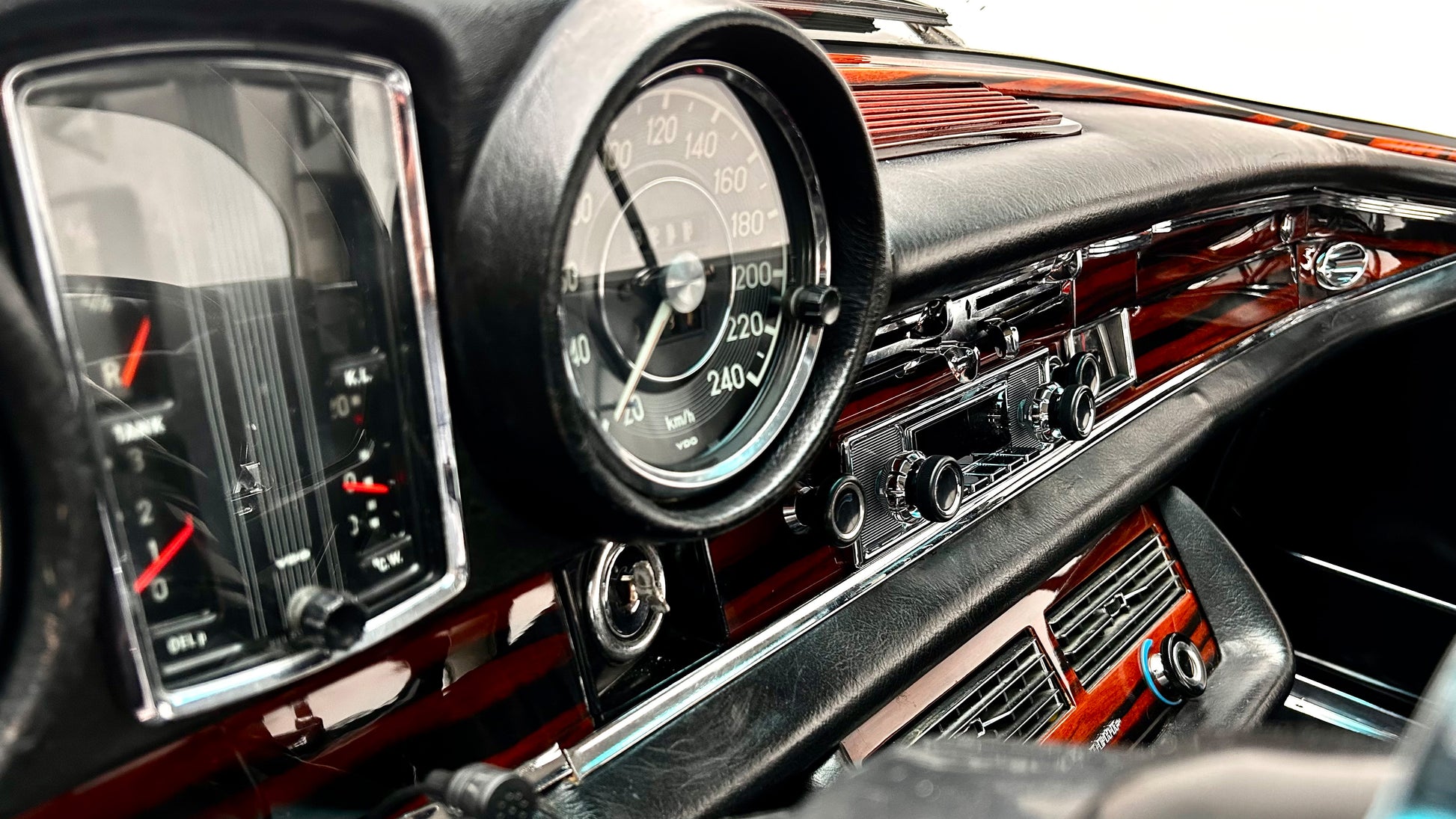 Ausgestattet mit der optional erhältlichen Klimaanlage und vier elektrischen Fensterhebern, hat dieses feine Coupé heute noch grösstenteils das originale Interieur, ergänzt durch ein stilgerechtes DAB-Radio von Becker. Lediglich die Teppiche und die Sitzpolster sind in den letzten Jahren erneuert worden, wobei die Sitze noch immer die ursprünglichen Bezüge tragen, was zum sehr stimmigen Bild mit den dunklen Holzeinlagen beiträgt. Alles in allem also eine seltene Gelegenheit, eine echte Krone deutscher Automobilbaukunst bald sein Eigen nennen zu können.