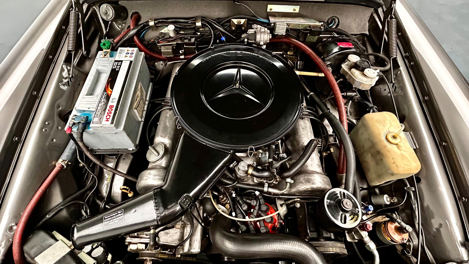 Was unseren angebotenen 280 SE/C noch begehrenswerter macht, ist sein 3,5 Liter-V8, der erst ab November 1969 angeboten wird – zusammen mit einem niedrigeren Kühler und einer flacheren Haube, was diesem Facelift-Modell ein moderneres, schlankeres Gesicht verleiht. Was ihn darüber hinaus zur ultimativen Version der Baureihe W111 macht, ist sein Schaltgetriebe. Von den 3270 gebauten Exemplaren mit dem V8-Motor wird bloss eine gute Hundertschaft damit ausgestattet.